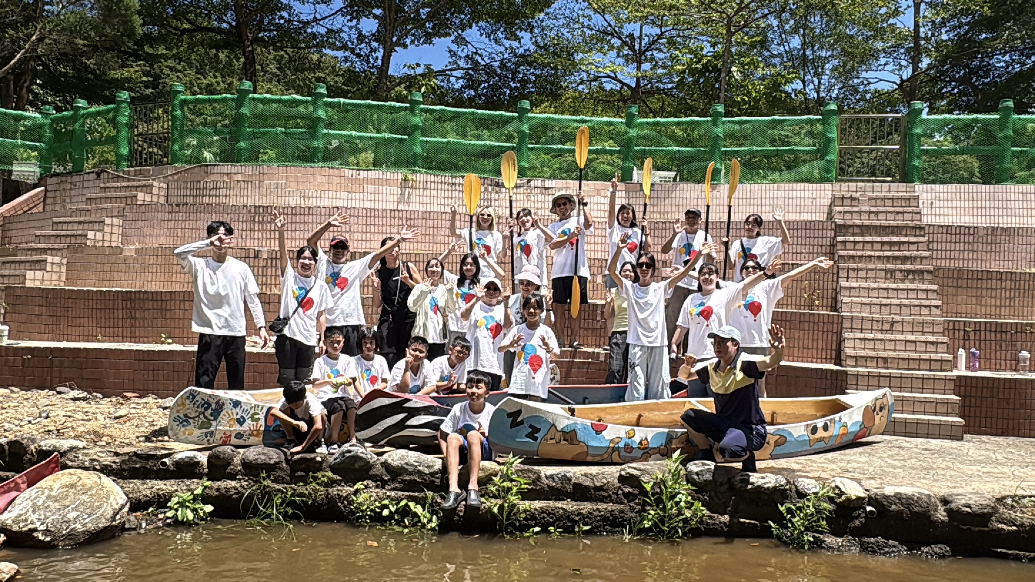 下水當天,大家進行最後修整,學習持槳、上下船的重心轉換與正確坐姿。擲瓶儀式後,獨木舟先在校旁小溪試航,再前往雙溪河體驗真正的水域航行。陽光炙熱,卻掩不住孩子的興奮與驕傲。當親手打造的木舟在水面上穩定前行,所有的疲累都轉化為成就感。這些木舟日後將留存在貢寮國小,成為常態課程與校園的一部分,也承載著這個夏天的共同記憶——在同一條船上,孩子學會合作,也重新看見貢寮。