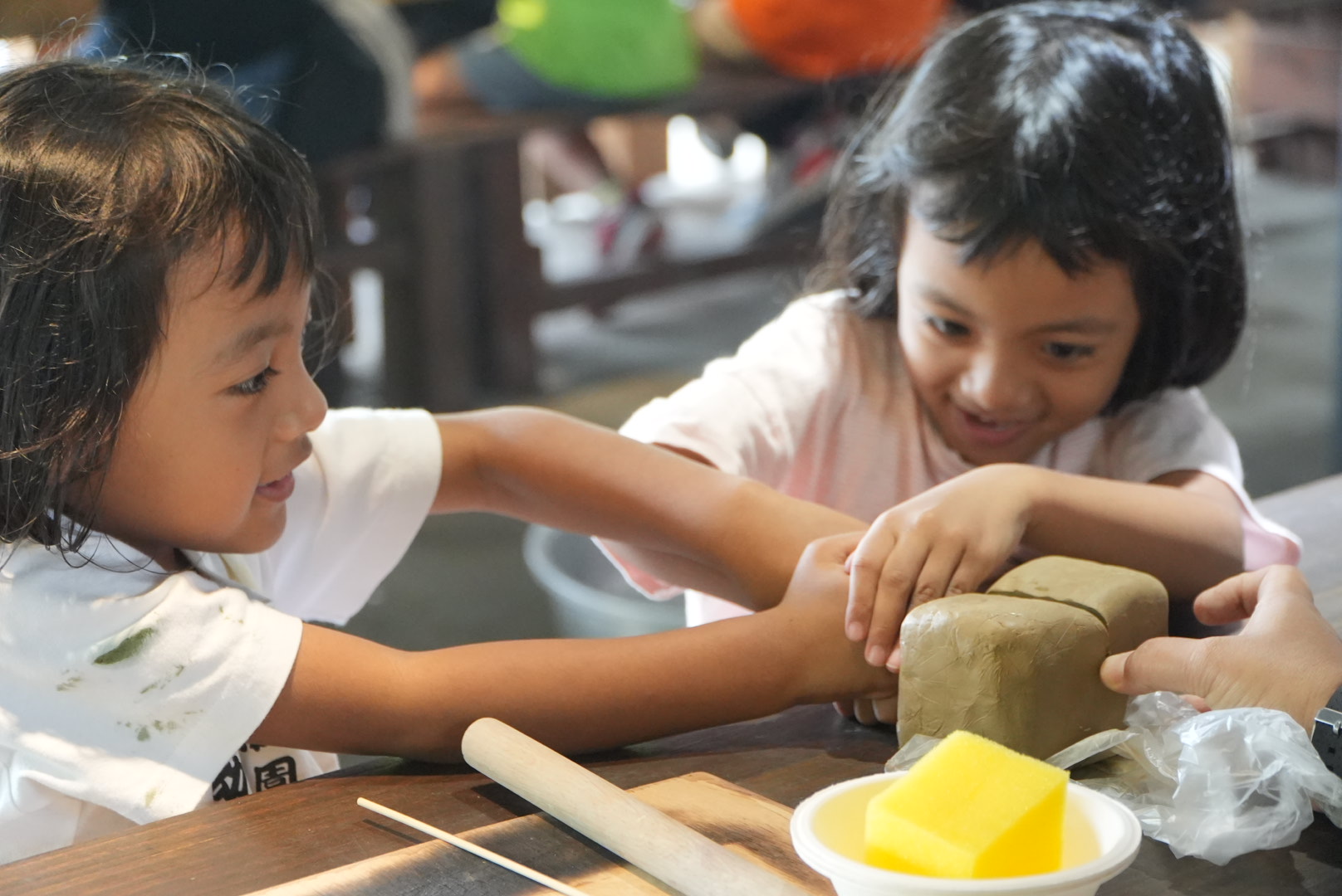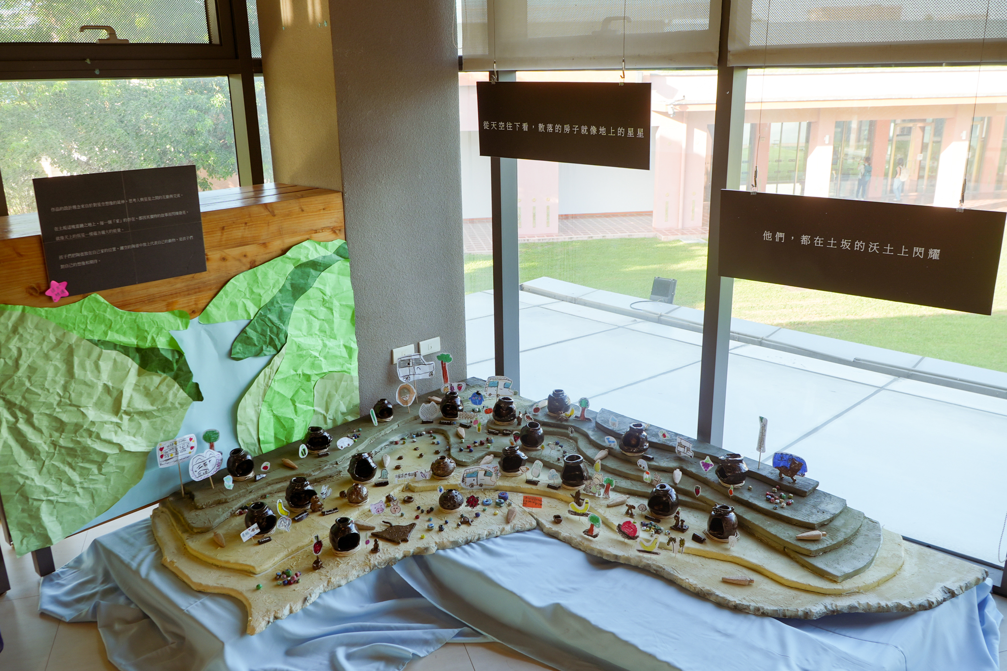 「陶壺」是本次營隊課程中的一大亮點,團隊特別邀請在地排灣族陶藝老師——游朝智,帶領孩子們從零開始學習陶土的塑形與製作,在反覆捏塑的過程中,親身體會工藝背後所承載的文化意義。我們將一個個小陶壺想像成孩子們的「家」,以動物作為個人象徵的創作意象,放入陶壺之中,結合傳統形式與自由想像,完成每一件獨一無二的作品。最後,以作品《umaq》為名,取自土坂的土地為基礎,將陶壺視為家的藝術創作,在展覽當天驚豔所有到場的觀眾。孩子手上捏的,是排灣的陶壺,也是自己心中最特別的那個陶壺。