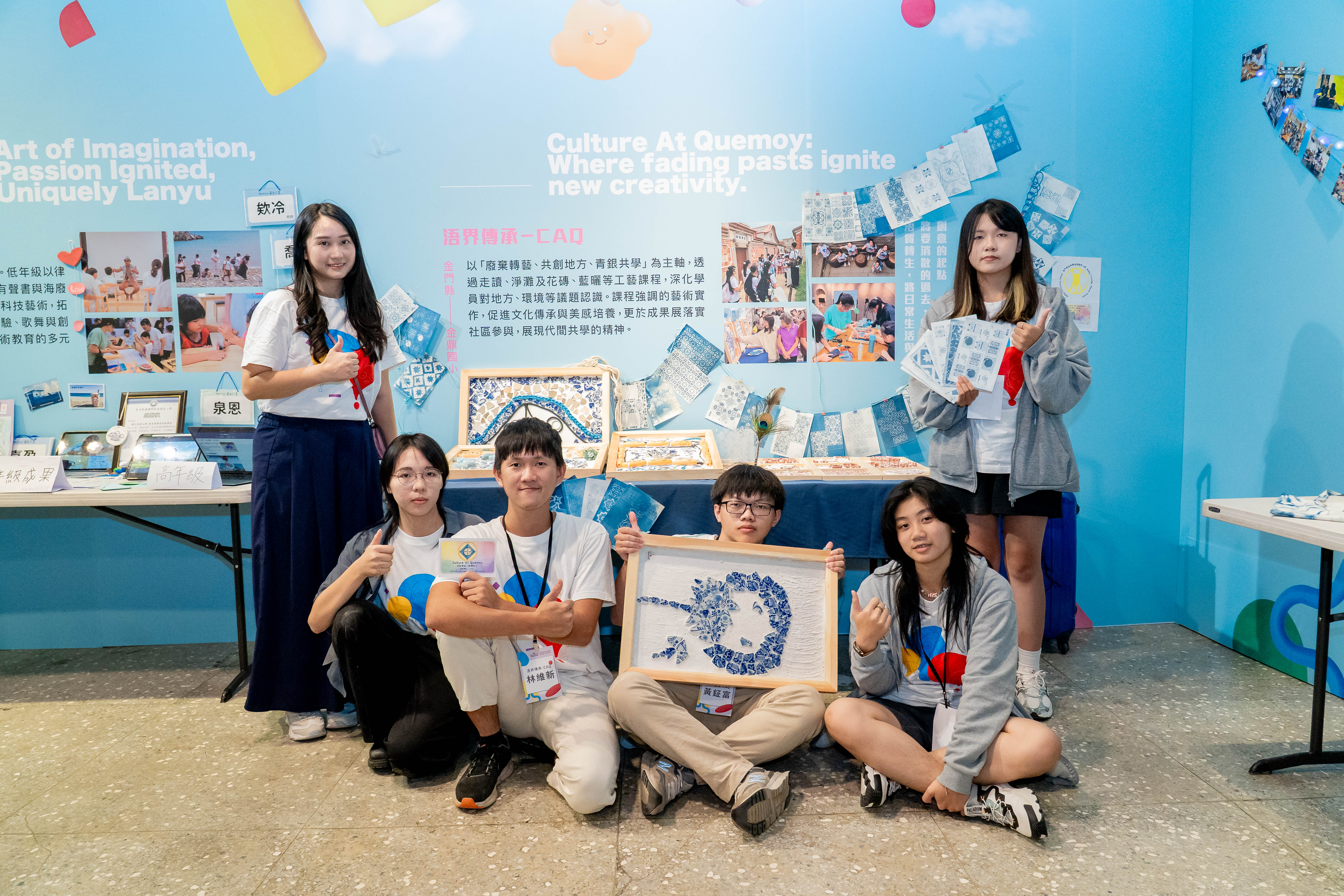 第九屆法藍瓷想像計畫團隊「浯界傳承-CAQ」,於金門縣金鼎國小辦理以「環境永續、藝術創新、社區共好」為核心的營隊課程。團隊以金門在地聚落為起點,帶領孩子們走讀社區、認識閩式建築與花磚文化,並透過花磚拼貼與藍晒圖等藝術創作,將觀察環境的所見所聞轉化為充滿溫度的藝術作品。最終,課程的成果也於盤山區公所展出,讓孩子的學習走出校園、走進社區,也在創作與分享的過程中,逐步建立對金門文化脈絡與土地環境的理解與認同。