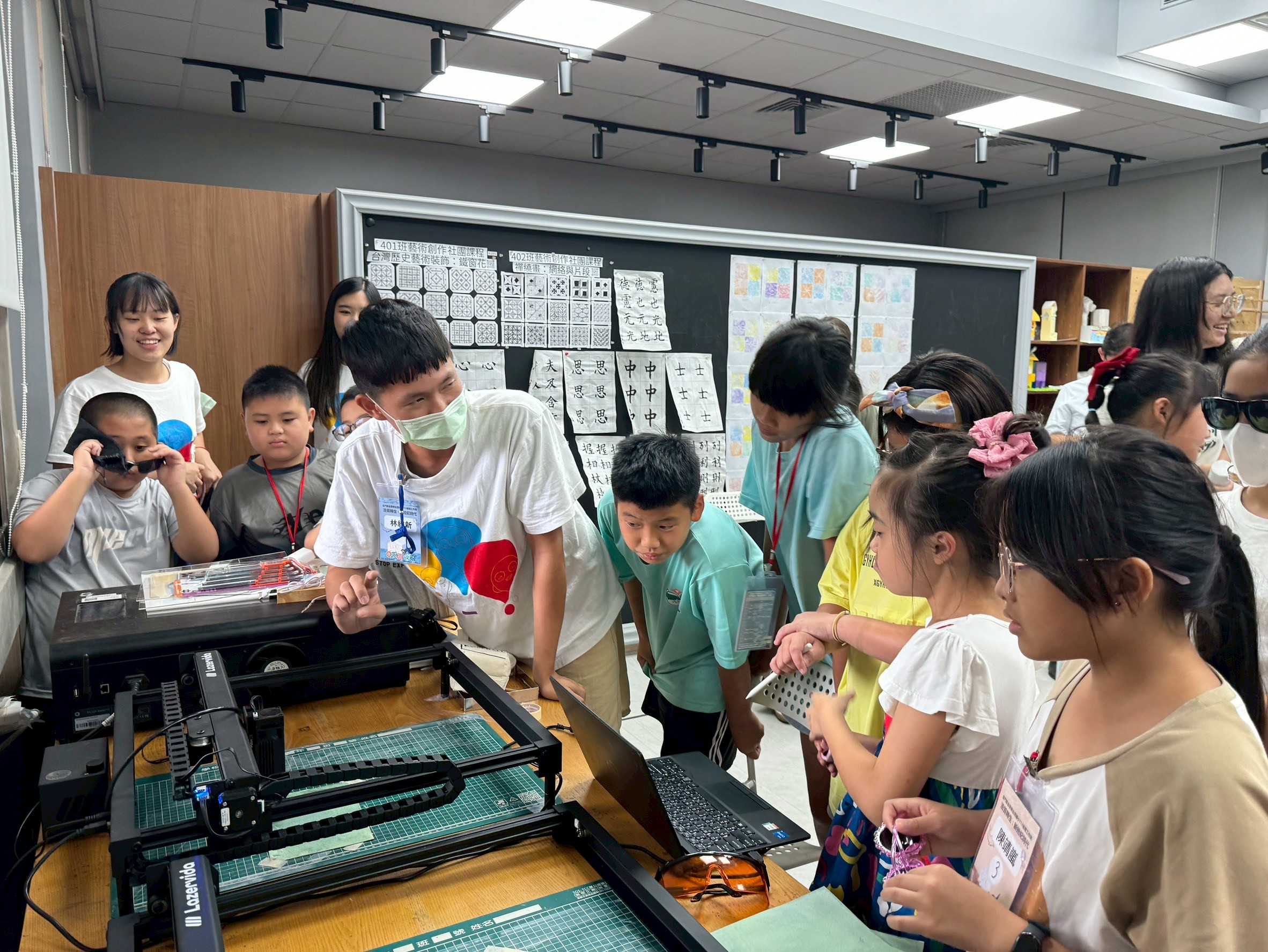 課程中,團隊引導孩子們將先前設計的花磚圖樣,結合藍晒技術與雷雕機操作進行創作,讓傳統工藝與現代科技結合。藍晒圖在顯影過程中產生的偶然變化,讓孩子體會手作中不可預期的美感;而雷雕機與鋼印的運用,則讓圖像能被轉印與重複呈現,開啟更多創作可能。從中,孩子們完成的作品不僅保留手作的溫度,也融入科技,成為結合藝術性與實驗精神的成果。