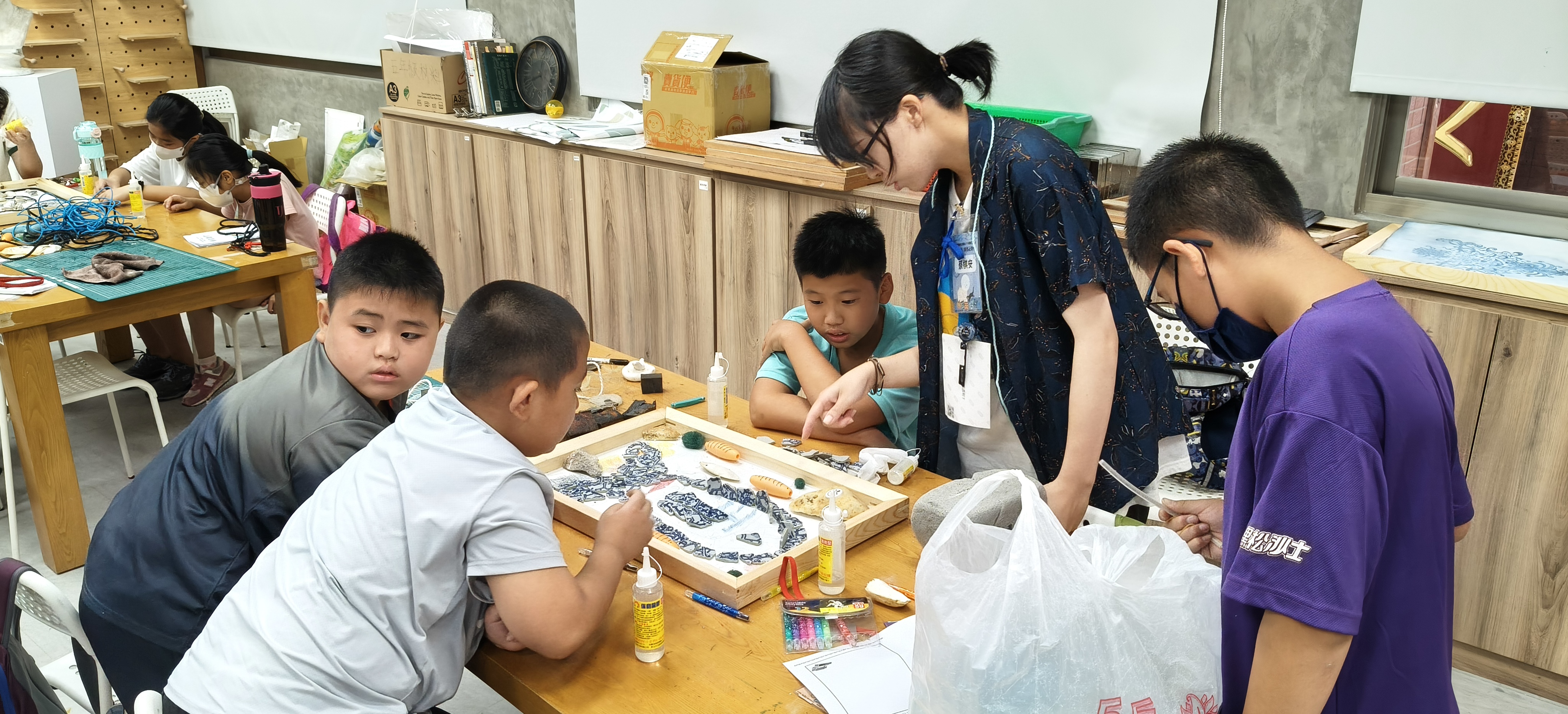 延續這份觀察,藝術課程引導孩子以「我的花磚,海的故事」為主題,運用海廢與海青花作為創作媒材,結合出磚入石與剪黏工法進行拼貼,無論是融入金門文化符號的大型花磚,或是個人專屬的花磚杯墊,都讓孩子把在海岸撿起的行動與感受,在作品中慢慢展現。